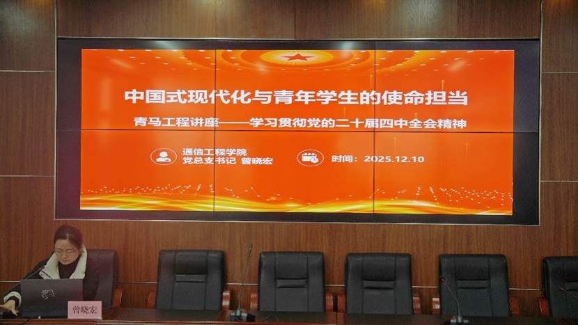 为深入学习贯彻党的二十届四中全会精神,引导青年学生深刻领悟中国式现代化的科学内涵与实践要求,自觉肩负起推进强国建设、民族复兴的时代使命。通信工程学院于2025年12月10日12:30在智联楼B307开展了2025-2026学年青年讲师团理论宣讲暨“青马工程”培训第一讲。本次培训由通信工程学院党总支书记曾晓宏主讲,培训主题为“中国式现代化与青年学生的使命担当——学习贯彻党的二十届四中全会精神”。本次讲座,曾书记“从党的二十届四中全会精神导读、......
